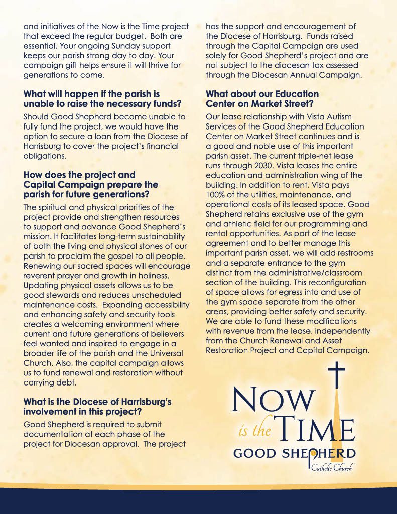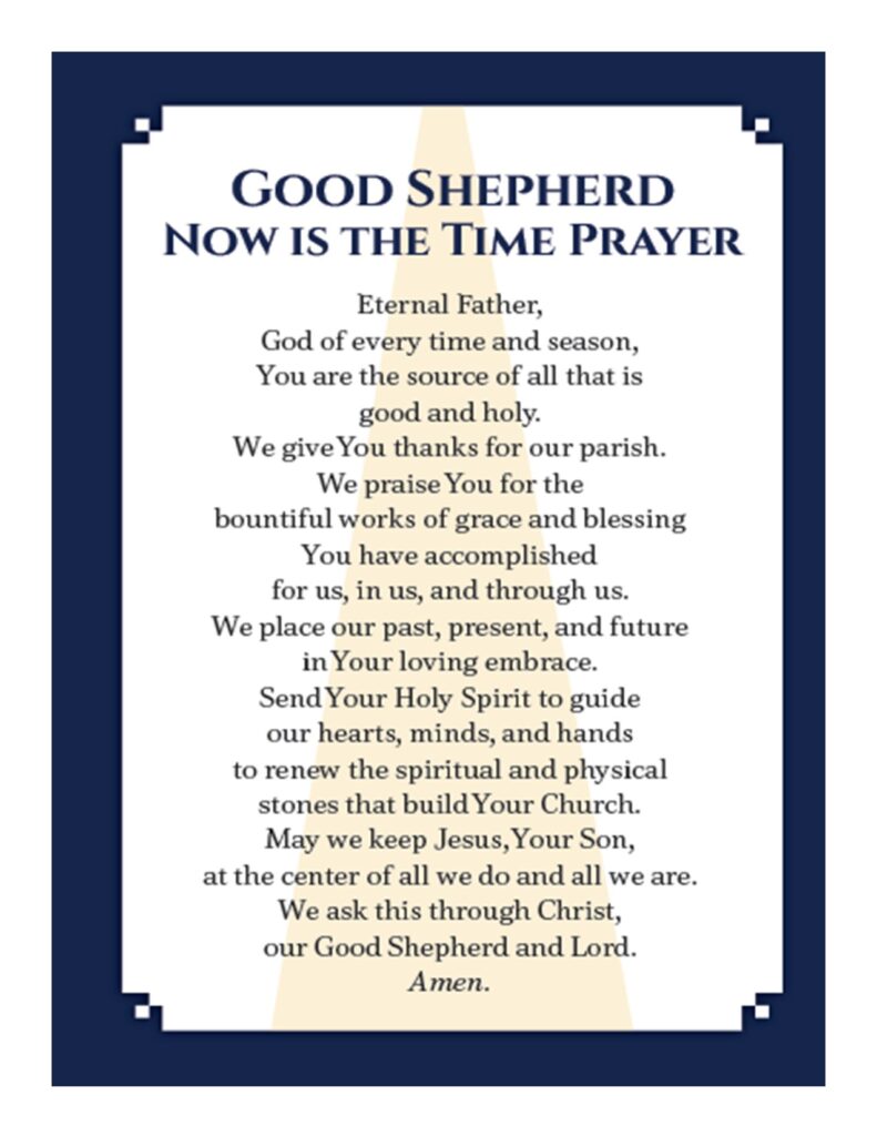 After much prayer, consultation, and discernment, we are launching our Now Is the Time Capital Campaign. This campaign will support and fund our efforts to renew, restore, and rejoice. It is an opportunity for each of us to be part of the legacy of generosity of Good Shepherd and to make an impact for generations to come. As we look to the future, we are called once again to be good stewards of the gifts God has given us and invest in the spiritual home we all cherish.
