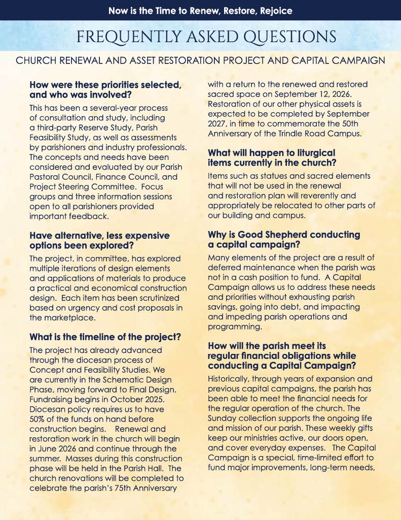 I understand that making a financial commitment is a significant decision. I ask you to prayerfully consider how you can participate. Every gift will make a difference. Your generosity will ensure that our parish remains a vibrant and welcoming place for all who seek God’s love and the community of His People. Now is the time for us to renew, restore, and rejoice in all our parish is and all that Jesus, the Good Shepherd, is calling us to be.