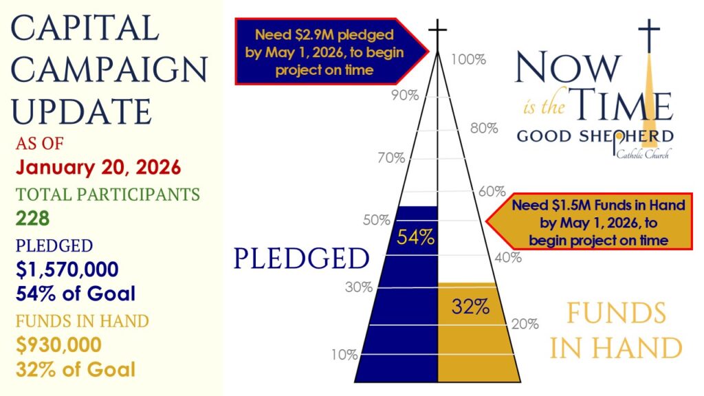 I understand that making a financial commitment is a significant decision. I ask you to prayerfully consider how you can participate. Every gift will make a difference. Your generosity will ensure that our parish remains a vibrant and welcoming place for all who seek God’s love and the community of His People. Now is the time for us to renew, restore, and rejoice in all our parish is and all that Jesus, the Good Shepherd, is calling us to be.