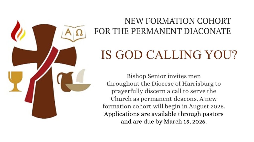 throughout the Diocese of Harrisburg to prayerfully discern a call to serve the Church as permanent deacons. A new formation cohort will begin in August 2026. Men between the ages of 30 and 62 who are active, prayerful Catholics are encouraged to speak with their pastor about this possibility. Applications are available through pastors and are due by March 15, 2026. Information sessions will be held on Sunday, January 25, 2026, at 2:00 p.m. at San Juan Bautista Parish, Lancaster; Tuesday, January 27, 2026, at 6:00 p.m. at the Diocesan Center, Harrisburg; and on Sunday, February 15, 2026, at Saint Pius X Parish, Selingsgrove. Bishop Senior’s full letter, which offers additional guidance and details, is available at https://www.catholicwitness.org/invitation-for-applications-to-be-permanent-deacons/.